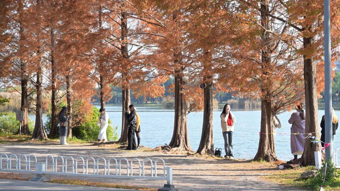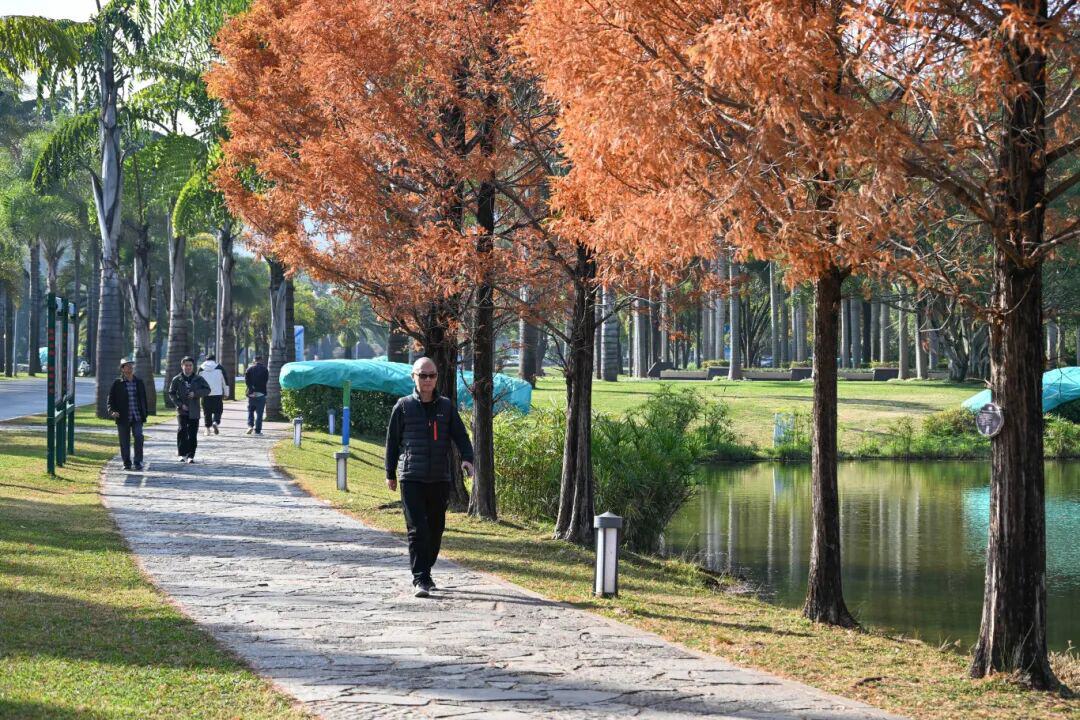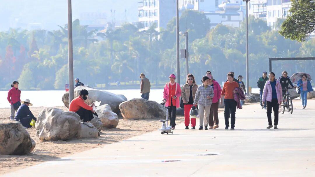 冬日的弥勒,阳光慷慨洒满每个角落,湖泉生态园中湖水泛金、绿树苍翠、水杉如画,成为游客抵达后的必访之地。“街道宽敞干净,山清水秀特别宜居,东北已经零下十五六度,这里气温太适合退休养老了。”吉林游客陈丛玲的赞叹道出了众多旅居者的心声。四川游客陈建华也直言:“物价便宜、环境舒适,回去一定会宣传,让大家都来弥勒。”