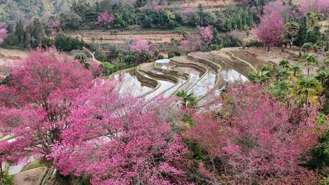撒玛坝万亩梯田堪称视觉盛宴,1.6万余亩田垄从海拔600米铺展至1800米,4300多级梯田在12月初至次年1月中旬迎来冬樱绽放,粉白嫣红的花簇与丰水期的银镜田面相映成趣,清晨云雾翻涌、午后花香萦绕,“四素同构”的生态农耕系统尽显人与自然的和谐之美。