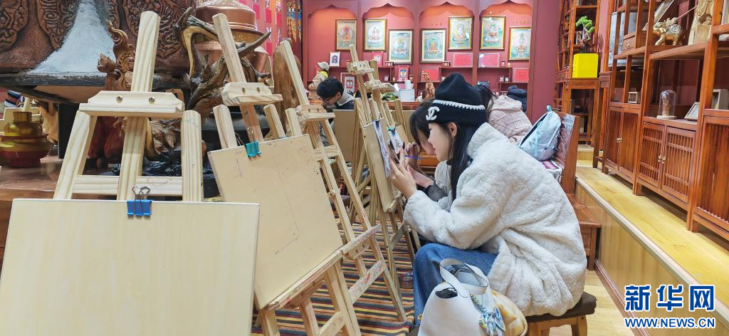2025年3月6日,游客在独克宗古城体验制作唐卡。新华社记者 浦超 摄