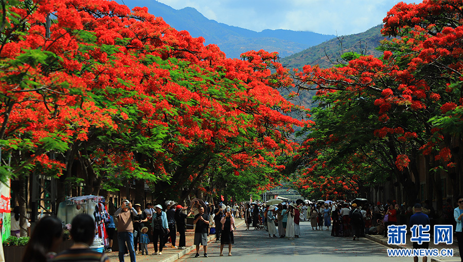 凤凰花开,凤凰大道上游人如织(5月21日摄)。新华网发(易门县摄影家协会 供图)